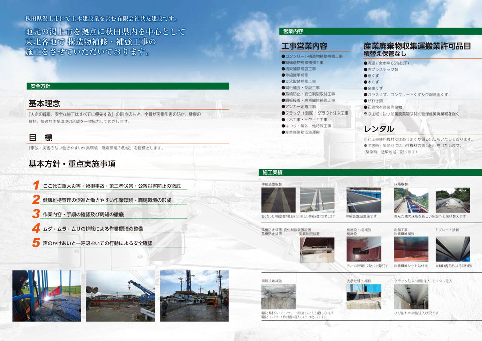 有限会社共友建設様は、地元の潟上市を拠点に秋田県内を中心として東北各地で構造物補修・補強工事の施工に携わっています。